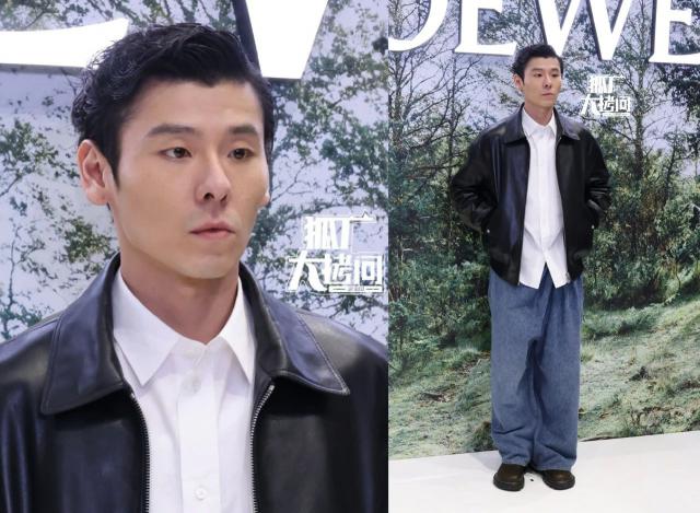 蒋奇明穿着黑色皮衣配白衬衫和蓝色休闲裤,配上短卷发,在时尚潮流中又带点酷,非常适合相貌个性的他。