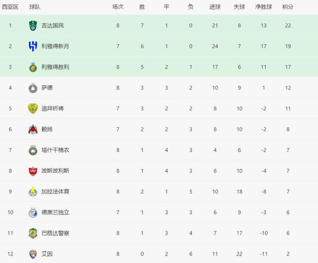 西亚区这里的情况同样明朗, C 沙特,罗为首 3 强队很早就晋级淘汰赛;吉达国民,利雅得新月和利雅得的胜利赢得了前三名。萨德、迪拜祈祷和赖扬也晋级了;艾因作为卫冕冠军,垫底出局。