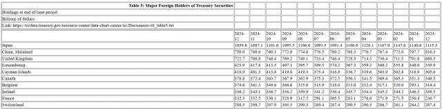 12月份美债前三大债主持股均下降,全部外资净流入超过870亿美元