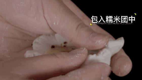 3. 取鸡蛋大小的糯米团,加入几片香蕉和少量红糖,轻轻压成饼状。