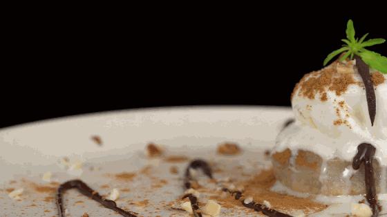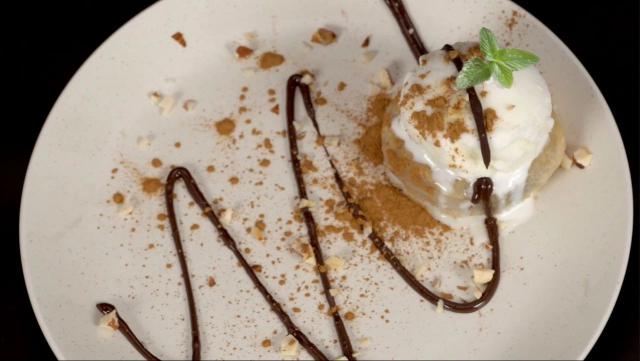 挤少量醇厚的巧克力酱,撒上一些坚果碎和肉桂粉,丰富口感,增加风味,然后放一片小绿叶和一个高大的甜点。 get