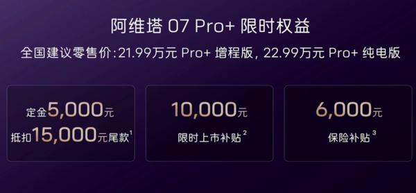 2 月 18 当天晚上,阿维塔召开了新车发布会,正式带来了阿维塔 07 Pro 新车型,新车搭载华为 ADS SE 智能驾驶,共带来增程版和纯电版两款车型,售价分别为: 21.99 万元和 22.99 万元。首次销售期间还可以享受官方购车补贴和定金膨胀。获得最低价格仅为 19.99 一万元,还可以再享受 6000 元保险补贴及 4000 元 21 与之前的阿维塔相比,英尺尺寸轮毂升级 07 更低的版本价格。