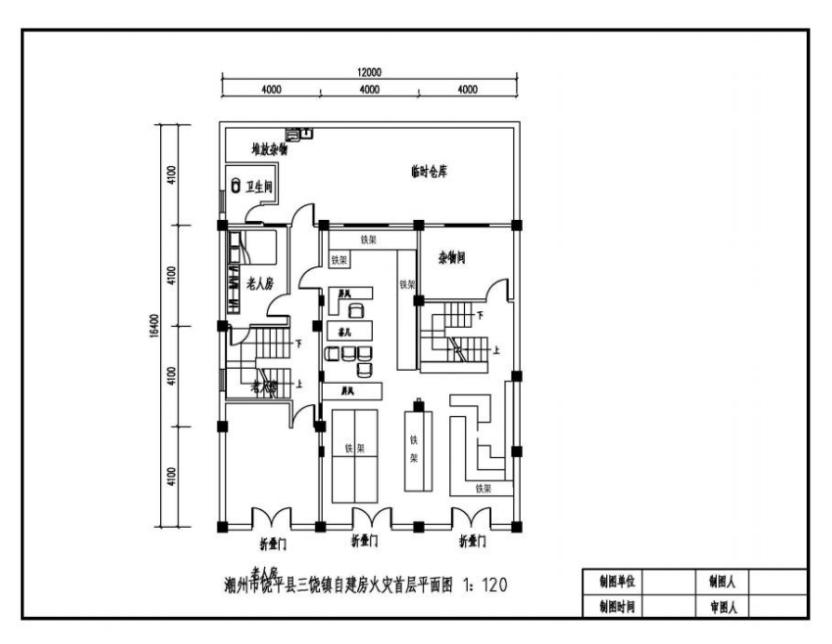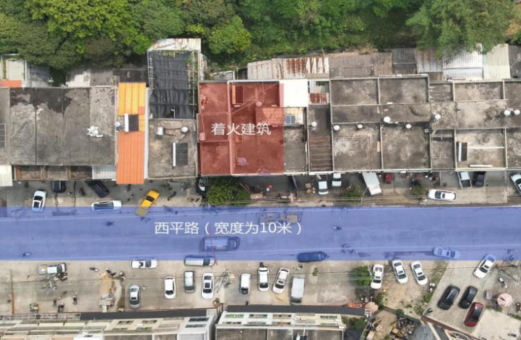 火灾建筑位于潮州市饶平县三饶镇南新村西平路485号。建筑主体为三层钢筋混凝土结构,坐东朝西。南北两侧靠近村民自建房屋,西侧为西平路,东侧为沟渠和山地。该建筑单层面积约160平方米,总建筑面积约480平方米。第一层是自营五金店,第二层和第三层是居住用的。