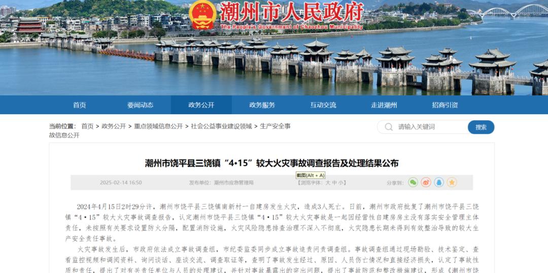 确定潮州市饶平县三饶镇“4.15”大火灾事故是一起较大的生产安全责任事故。