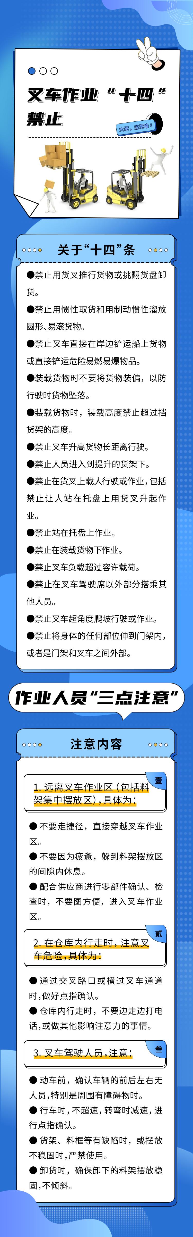 除“十四禁”和“三点注意”外,租赁单位和场所管理单位应在叉车进场施工前检查叉车的使用登记证、定期检查报告、操作人员证等证明材料,并留案备查。