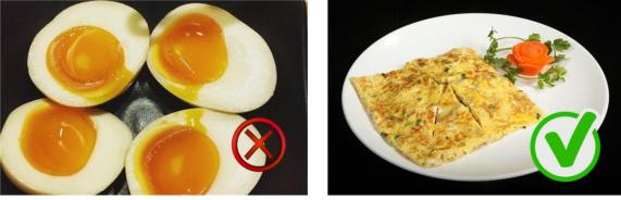 ②鸡蛋:使用鸡蛋前,清洁鸡蛋外壳,必要时对外壳进行消毒。烹饪时,一定要彻底煮熟。不允许提供三文治、沙拉等以鸡蛋为原料,不需要完全加热的食物。