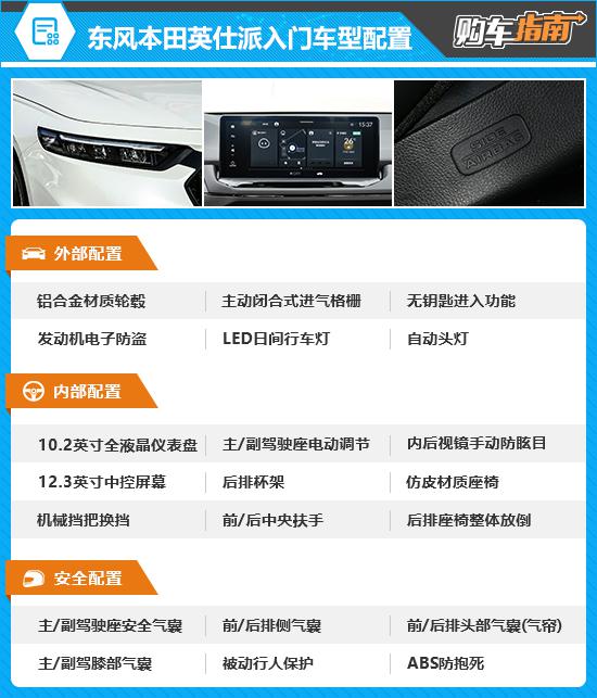 2025 东风本田英仕派的入门级车型是 260TURBRO 优雅版本,参考价格为 18.28 万元。如 LED 日间行车灯,主动关闭进气格栅,12.3 英寸中控屏,主 / 副驾驶膝部气囊等都有配置,但是缺乏舒适性和方便性的配置,所以不推荐。