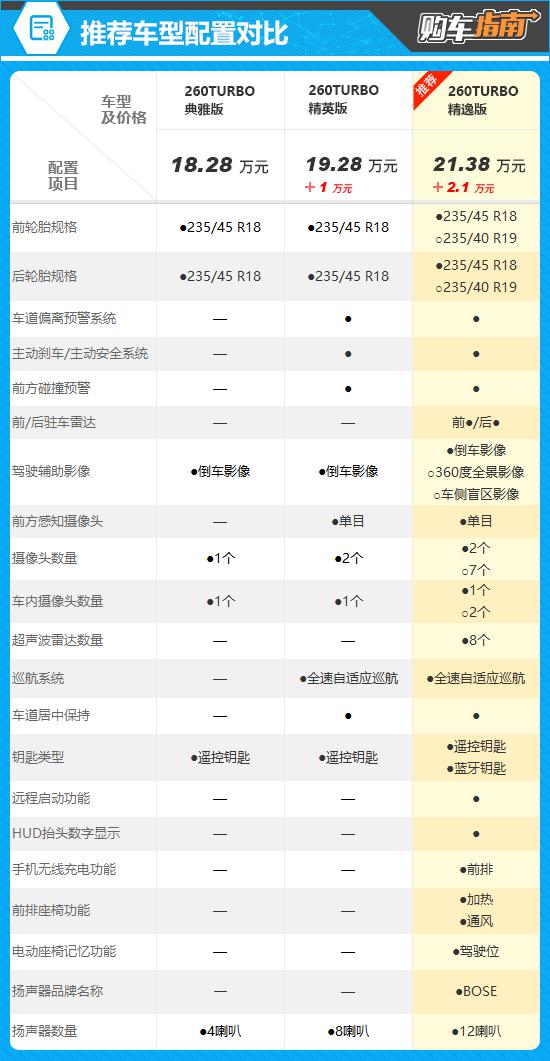 这次推荐的是价格 21.38 万元的 260TURBRO 精致版,通过配置对比可以看出,与低级别车型相比,推荐车型在安全性、用车舒适性、方便性等方面都有所提升,比如增加前。 / 后停车雷达,远程启动功能,前排座椅加热 / 通风等等。尽管价格上涨 2.1 一万元,但是新增设备绝对物超所值,可以带来更好的用车体验。