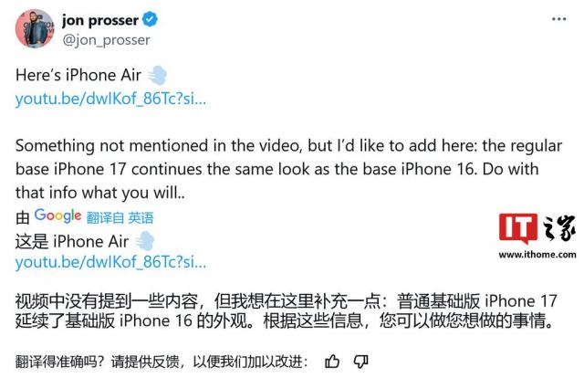 IT 世家 2 月 19 日消息,YouTube 频道 Front Page Tech 主播 Jon Prosser 在曝出 iPhone 17 Pro 和 iPhone 17 Air 渲染之后,昨天在那里 X 平台发表文章,透露苹果 iPhone 17 专业版将沿用老款设计,代表今年 iPhone 17 系列会有 3 各种设计方案。