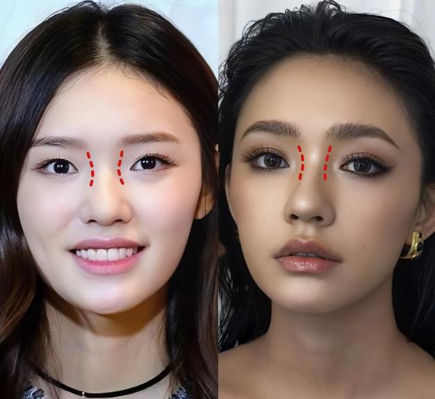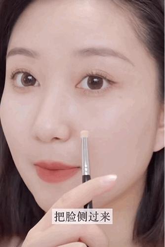 用阴影加剧眉毛和鼻梁之间的小三角区域。,“平地提升山根”让小双 C 线条变得更加立体明显,眼距宽的问题也一起得到改善。