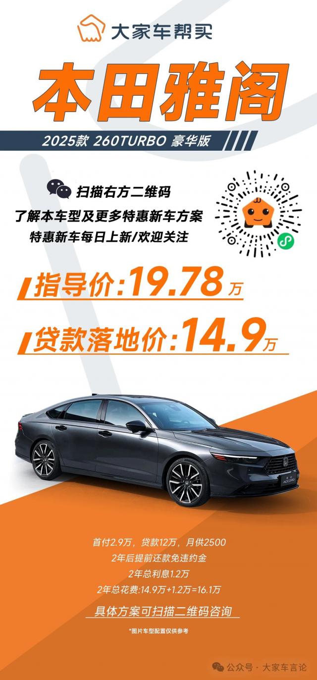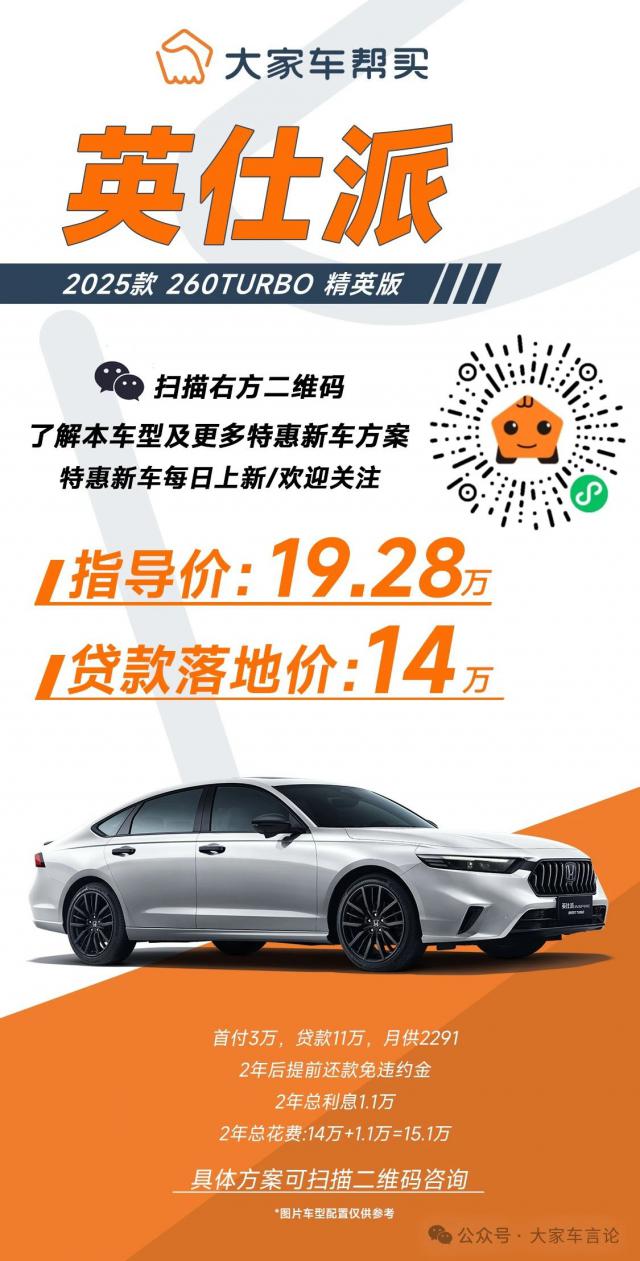 过去稳定的合资汽车在国内汽车厂的内卷、拼杀下, B 级车的价格可以算是大跳水了。本期特价新车主角-参考价格 19.28 万的英仕派 2025 款 260TURBO 精英版,现在贷款落地价只要 14 万整!首付 3 一切都可以开走。落地价格比出售思域的最低参考价格便宜。 2900 元(当然,现在思域落地也只需要 10 万出头),而相对于参考价格相近的兄弟车型豪华雅阁 14.9 万落地,也更便宜近 1 万了。并且这是最新的 25 汽车,不是那种库存较长的特价车。