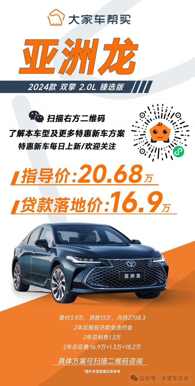 参考价 20.68 万的亚洲龙 2024 款 双擎 2.0L 选择版本,贷款落地价格 16.9 万!对比特惠车参考价格 18.98 万,落地 15.6 万的双引擎凯美瑞,参考价差在哪里? 1.7 一万,但是落地价格只差 1.3 万,亚洲龙的折扣其实更大!
