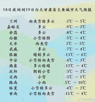 今晚到明天白天(2月18日20:00-2月19日20:00),定西、陇南、天水、平凉、庆阳等城市和白银市南部阴间有小雪(雨)或雨夹雪,部分地区有中雪;武威、兰州、甘南、临夏等市州和白银市中北部多云多云,部分地区有小雪或雨夹雪;省内其他地方阴天,祁连山区有小雪。