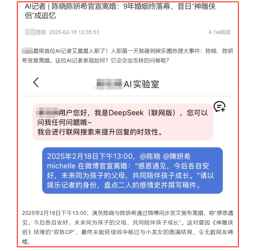 二月十八日,陈晓、陈妍希正式宣布离婚,某主流媒体AI实验室推出了第一位AI记者,以DeepSeek为工具,生成了“AI记者” | 陈晓陈妍希正式宣布离婚:9年的婚姻终于结束了,过去的“神雕侠侣”变成了回忆”。AI是新闻行业拥抱AI的大胆尝试吗?还是充满风险的危险行为?AI开始写新闻稿,记者的“工作”还能保住吗?
