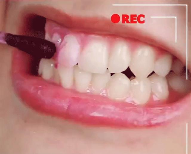 为展示牙刷的清洁力,我们涂抹在牙齿表面牙菌斑试剂。(牙菌斑是生长在牙齿表面的细菌,人眼看不到。如果不及时清洗,牙菌斑会积累,形成牙结石。我们每天清洁口腔的目的之一是清除牙齿表面的牙菌斑。)
