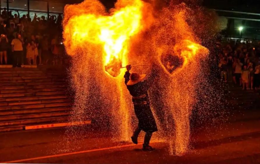 同样极具视觉冲击力的火壶表演则是景区新宠,隐隐有压过打铁花的势头。