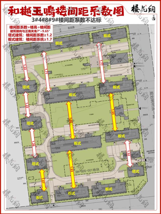 花姐在测量了楼距指数之后,发现有一些楼距指数, 4 板楼不符合标准,分别是3#、4#、8#和9#,建筑距离指数分别为1.65、1.66、1.63、1.67。