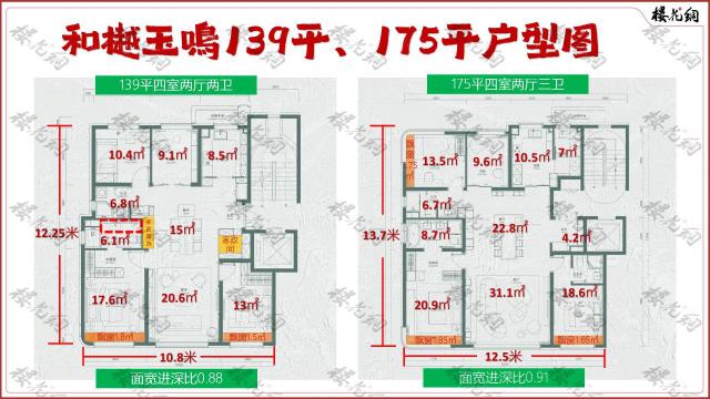 139平米和175平方米的房间类型,各送2个朝南飘窗;212平米和253平方米的房间类型,是零赠送。