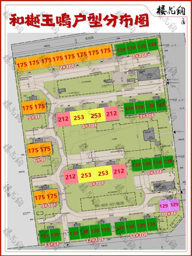 其中 139 平方米的房型,分布在 1#、3#、7#、11#-13#;175 平房型,分布于 2#、5#、6#、9#;4#、8# 的端户为 212 平方米的房间类型,中间是 253 平米房型。