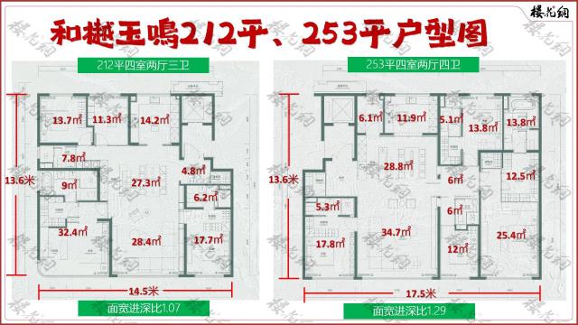 这些都涉及到楼王 4# 和 8#,端户为 212 平方米的房间类型,中间是 253 平米房型。