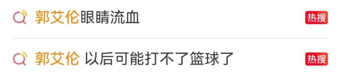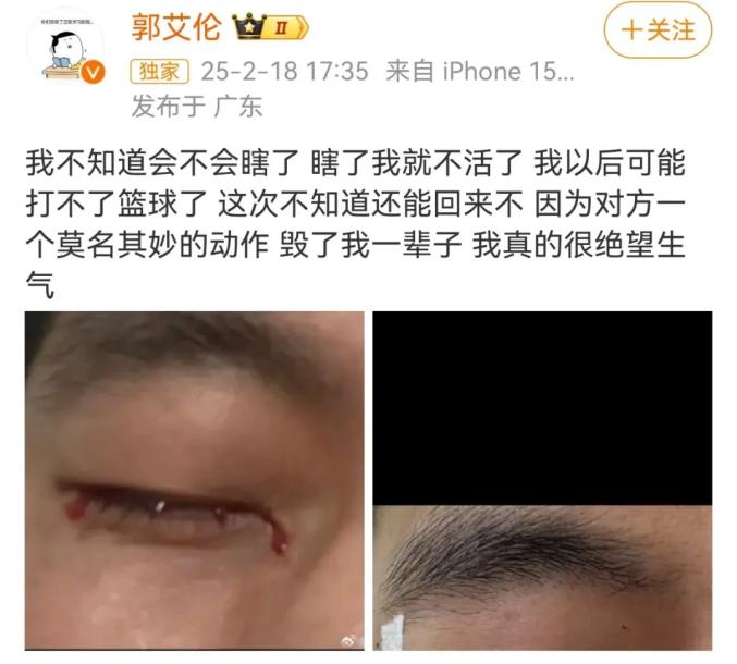 同一天,郭艾伦在个人社交平台上拍了一张眼睛流血的照片,并附上了一篇文章:不知道会不会瞎。如果我瞎了,我就不会活了。我以后可能打不了篮球。不知道这次能不能回来,因为对方无缘无故的动作毁了我一辈子。我真的很绝望,很生气。