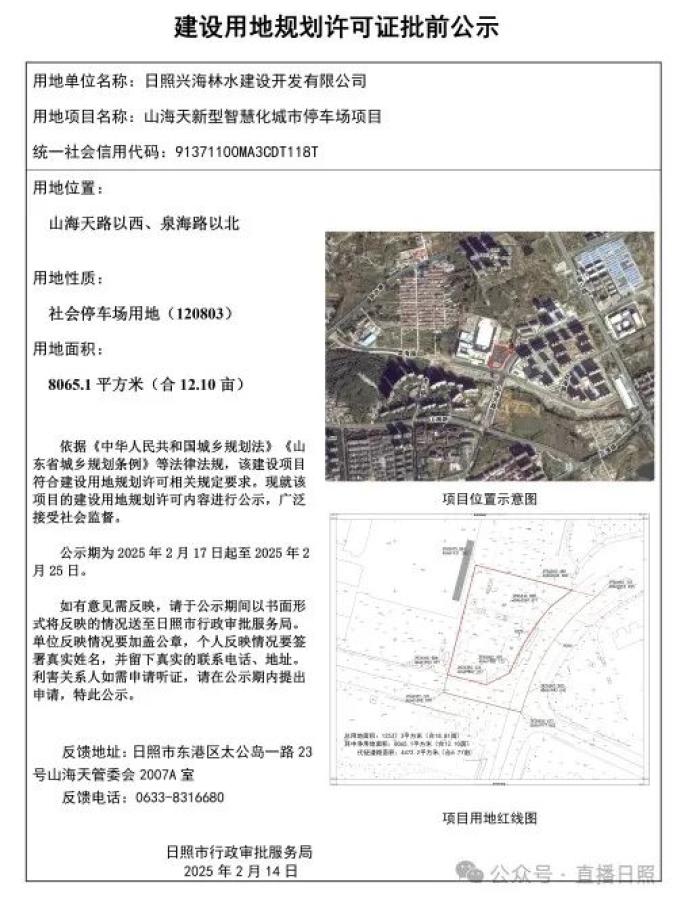 公告显示,该项目用地位于山海天路向西,泉海路向北;用地性质为社会停车场用地;用地面积共8065.1平方米(合12.10亩)。