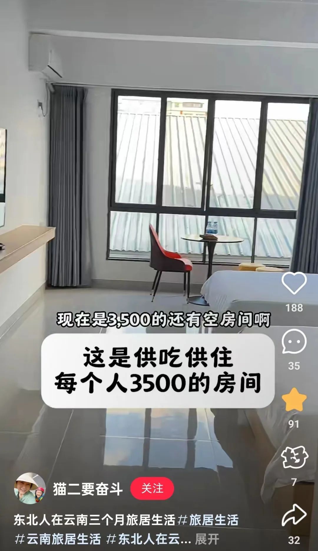 一间大房子里有两张床,可以管吃管住,如果想自己做饭,钱就会少一些。