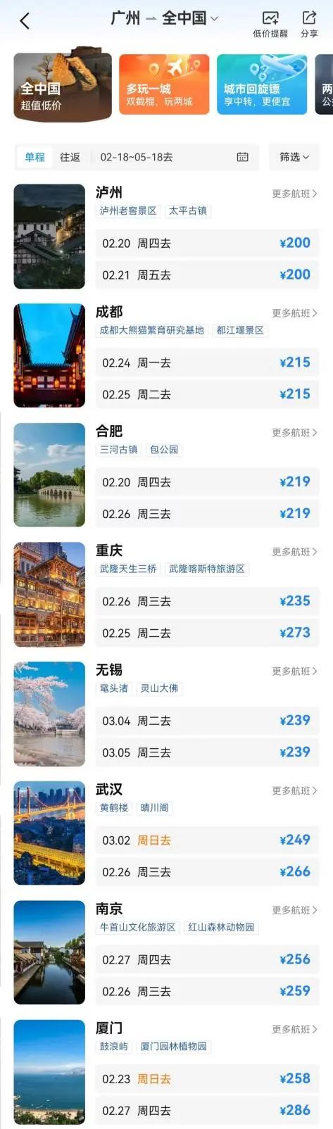 打开各大OTA平台的“特价机票”功能栏,从北方、广州、深圳等大城市出发的多个国内航班,最便宜的一趟,裸票的价格只有200元起步;如果加上机械建设的燃油成本,机票的起步价不会超过400元,远比春节假期单票接近1000元的机票便宜。
