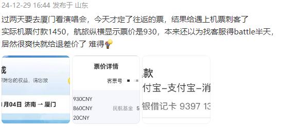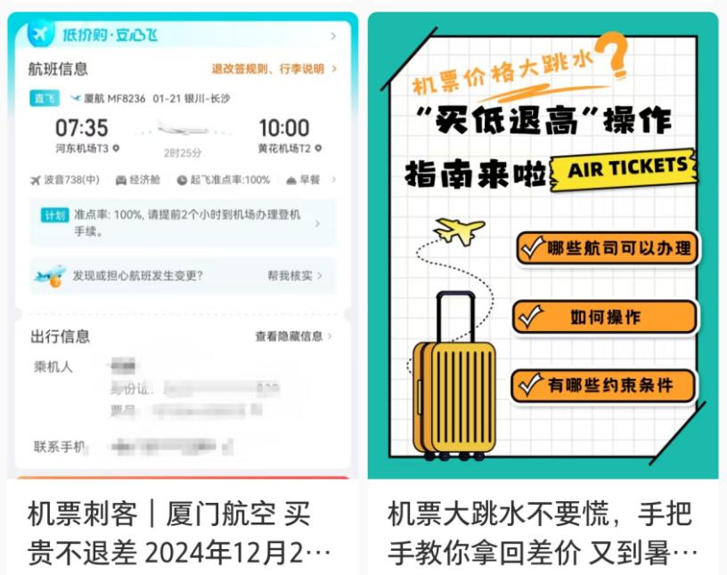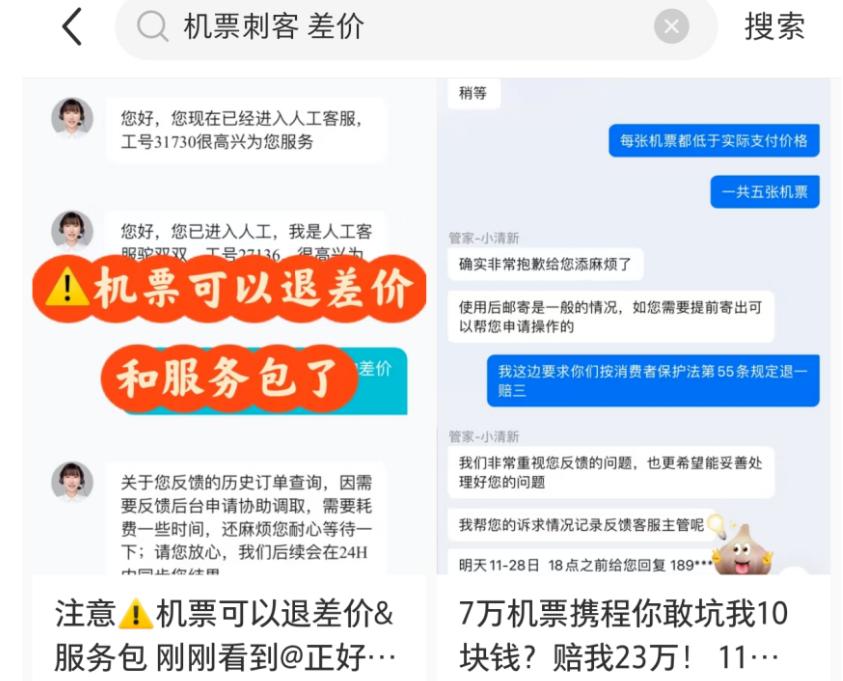 然而,也有成功获得赔偿差价的案例。在社交平台上,类似的机票有很多“买低退高”的策略。(图/社交平台截图)
