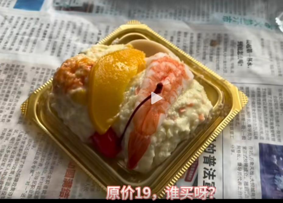 一个女孩在上海花了 11.9 元买了一个寿司盲盒,先是原价, 19 一块沙拉让她感到翻车,120g。 沙拉只有两个黄桃,一个樱桃,一只虾,还有四分之一的鸡蛋。...