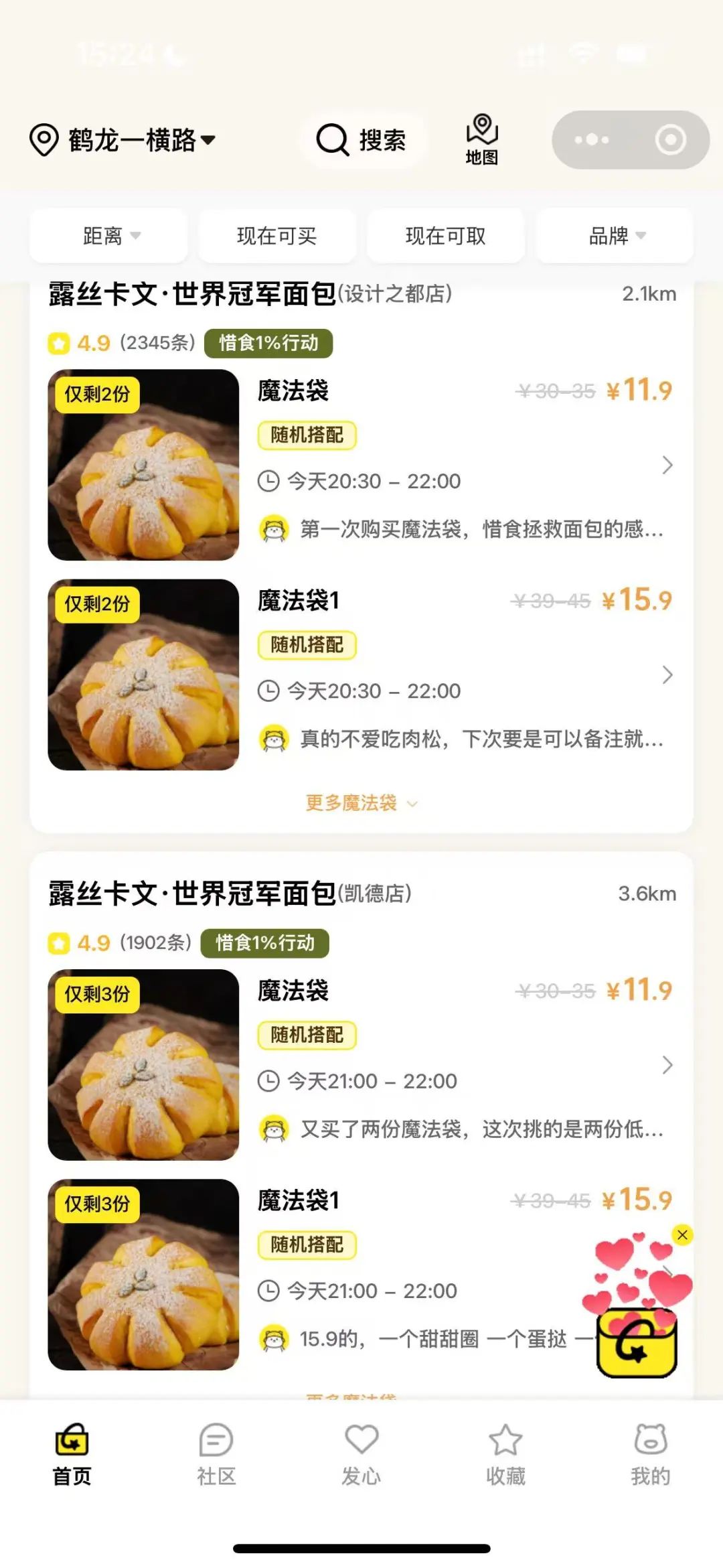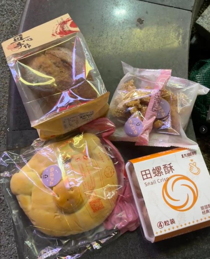 一位来自广州的小姐姐分享了自己。 “ 惜食 ” 购买盲盒,先用 19.9 元在露丝卡文买了一个奶酪坚果欧包和肠仔包,然后是花 14.9 元至皇冠·玛丽奥买了一盒奶香吐司、三明治蛋糕和一大盒瑞士卷。