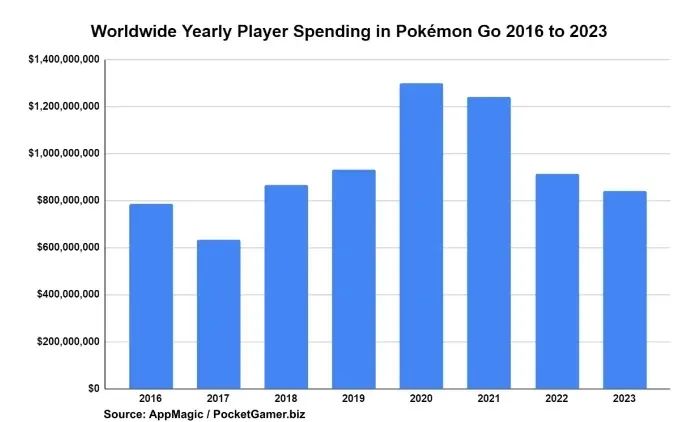 根据Appmagic的统计,2020年由疫情期间的“宅经济”推动,《Pokémon Go》利润达到顶峰,曾经的利润约为13亿美元。但是随后逐渐下降,2021年小幅下降到12.4亿美元,2022年进一步缩水到9.1亿美元,2023年甚至下降到8.4亿美元。《Pokémon Go》自2017年(6.3亿美元)以来,收入最低。