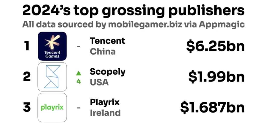 (Mobilegamer.2024年biz发布的全球手机游戏发行商收益榜,Scopely排名第二)