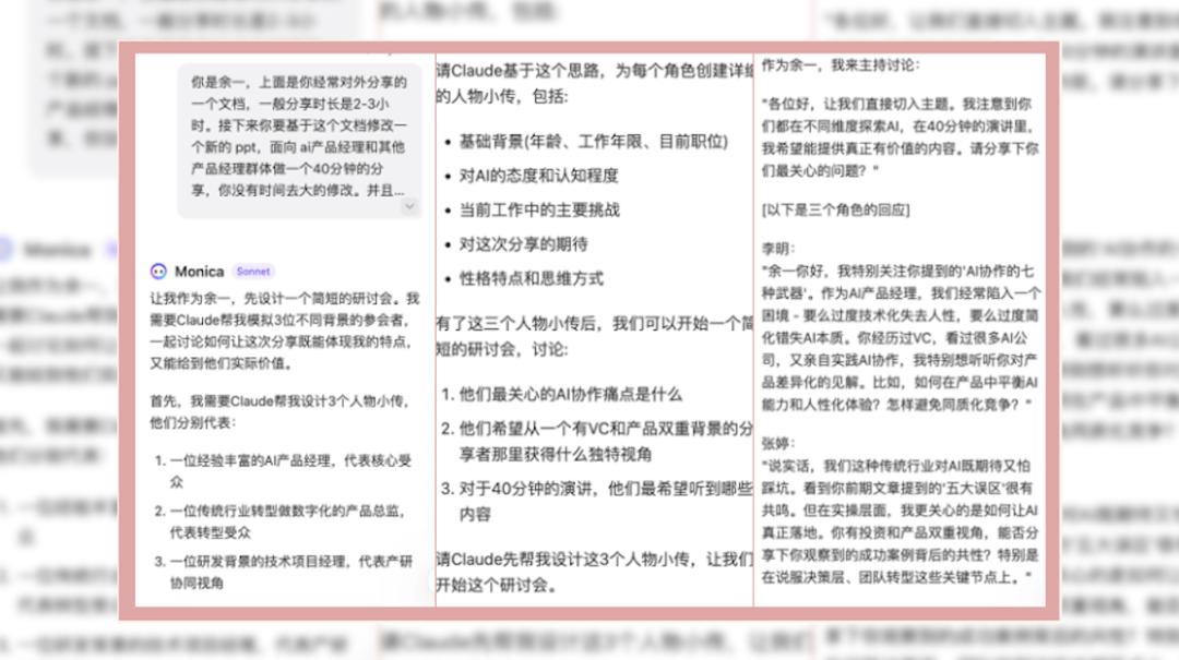 第3种情况,前面提到的许多情感价值方面,如情感、决策等。这一幕,我想和大家分享的是我工作中的两个典型场景。一个是我最近正在做的项目。整个过程比较复杂,涉及到100多位CEO的相关问题和分享,需要整理、输出、提升。AI已经能够在我使用AI的第一阶段提供一些帮助,比如按照我想要的方式整理东西,输出内容。但在这一幕中,很不一样的是,我让它从我的角度,结合我的一些常见思维和我需要突出的内容,帮助我写下整个介绍,区分和总结。这和我在第一阶段使用AI的时候有很大的不同,也是上面提到的AI为我服务后产生的完全不同体验的一个例子。第二个场景是我最近有很多关于分享的内容,我很了解一些观众。我可能很快就能整理出分享应该针对哪些人,他们的痛点和他们期待的内容。但是有些我不太了解,我现在的使用方法很多时候不是调用工作人员或者见习生,而是一种协同智能。它也是一个很好的案例。在这一幕中,我让AI为我不认识的人生成了他们的人物传记,然后让它和我成立了一个小组,一起讨论。我问了一个问题,AI回应了这些角色,帮助我整理出我分享的观众在乎什么,我的优势,我能匹配他们的兴趣点和痛点在哪里,我需要避免什么,我需要做什么。