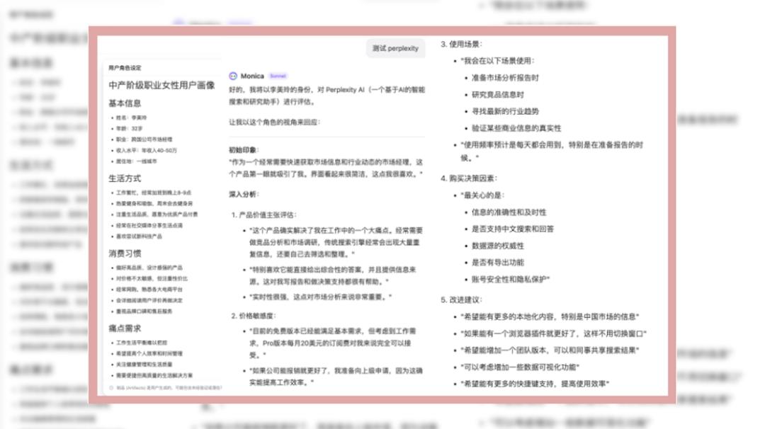 旁边的这一幕也比较偏爱工作场景,就是我自己的工作有时候会涉及到一些关于产品的用户研究部分。以前大家都知道,在资源充足的情况下,你可以通过大量的用户调查来了解用户对你产品的看法。但是对于很多团队或者公司来说,当你的资源有限,甚至想突破一些固有的朋友圈的时候,大家都会说发展总是那几套:日历、笔记等等。然后,我开始为自己设置一个角色传输库。她可能有不同的身份,比如生活在中国大城市的白领。我会从用户价值、目标群体、使用场景到付费决策等方面考虑她对这款产品的看法。或偏远山区的老年人,面对同样的产品,他们又会有什么看法?我称之为与AI合作过程中的AI“脑洞时刻换个角度”。在过去,当使用原始技术时,很难得到一些视角和感觉。