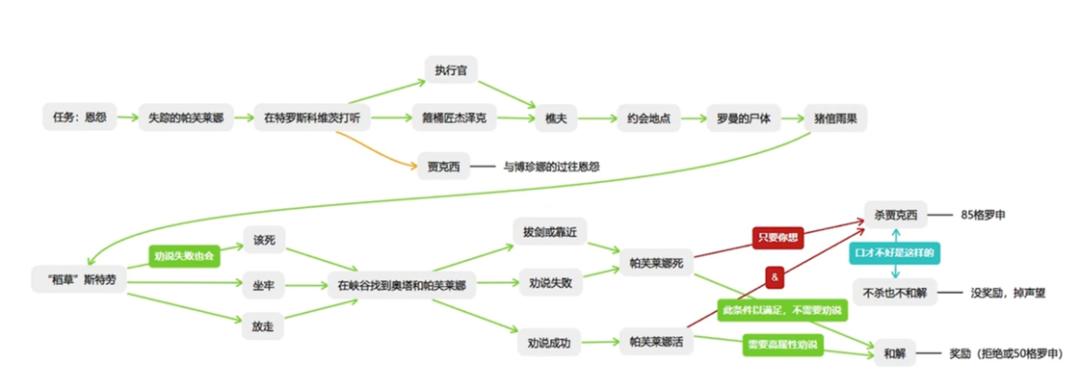 还有一个叫“恩怨”的分支任务,用同样的招数找人,期间会涉及几起谋杀案。有玩家列出了这条任务线上的一个分支图,发现结局高达四个。你知道这只是一个小分支。