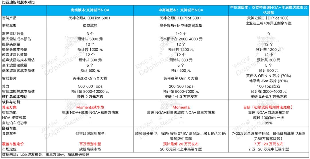 ② 对比亚迪三个智驾版本的硬件和软件设备进行拆分(结合第三方调查信息):