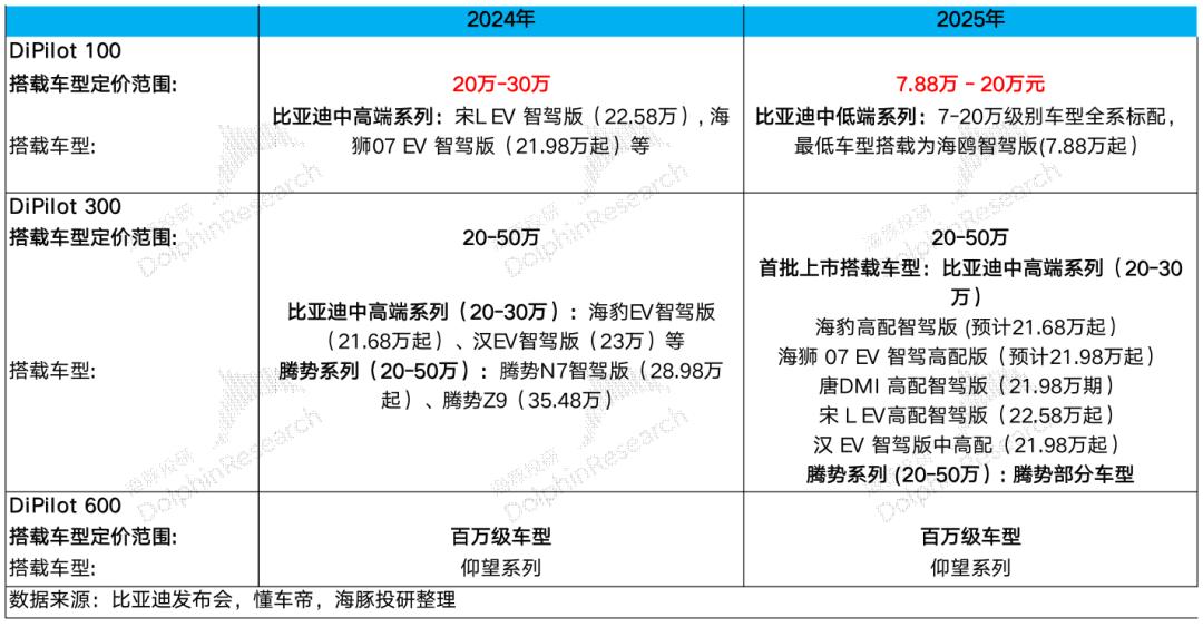 与此同时,与2024年搭载车型价格带的边际变化相比,中高档智驾版本(Dipilot300//)Dipilot 600) 与2024年相比,搭载车型的价格带基本没有变化;真正的智能驾驶价格带下沉最大的是中低档智能驾驶版。(Dipilot 100),从2024年20-30万元到2025年7-20万元,搭载车型的定价范围也是比亚迪销售的基本板块,低价车型“智驾下沉”将成为比亚迪2025年的最大增量。