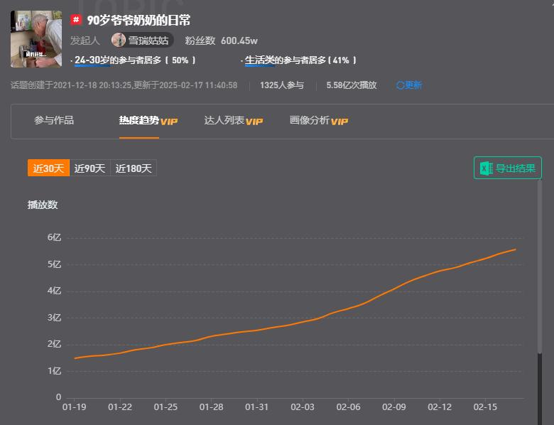 到目前为止,话题#90岁爷爷奶奶的日常#播放量已经达到5.6亿,新抖显示,近30天来,这个话题的新播放量已经超过4亿。
