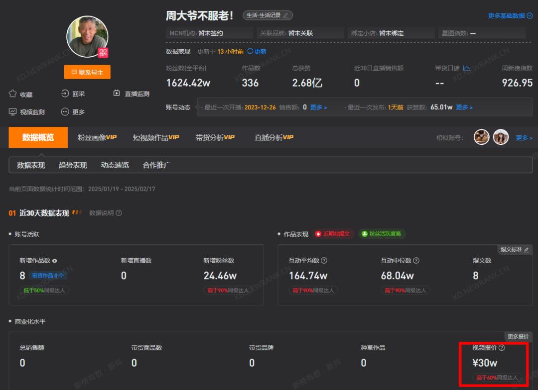 就拿“周大爷不服老!”抖音帐号来说,新抖后台显示,目前该博主21-60秒视频报价为30万,同级大咖超过60%。