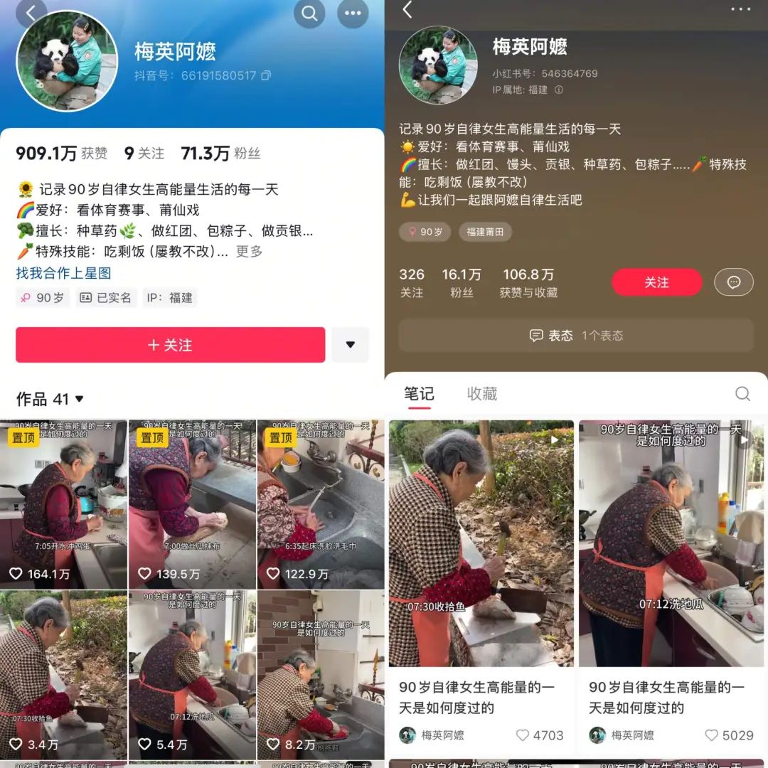 “梅英阿嬷”凭借一系列“高能vlog”在各大平台上迅速起号,从一月份开始更新视频到现在,短短一个月的时间,“梅英阿嬷”在抖音的粉丝数量从0增加到71.2万,三个视频点赞超过百万,小红书的粉丝数量也超过了16万。
