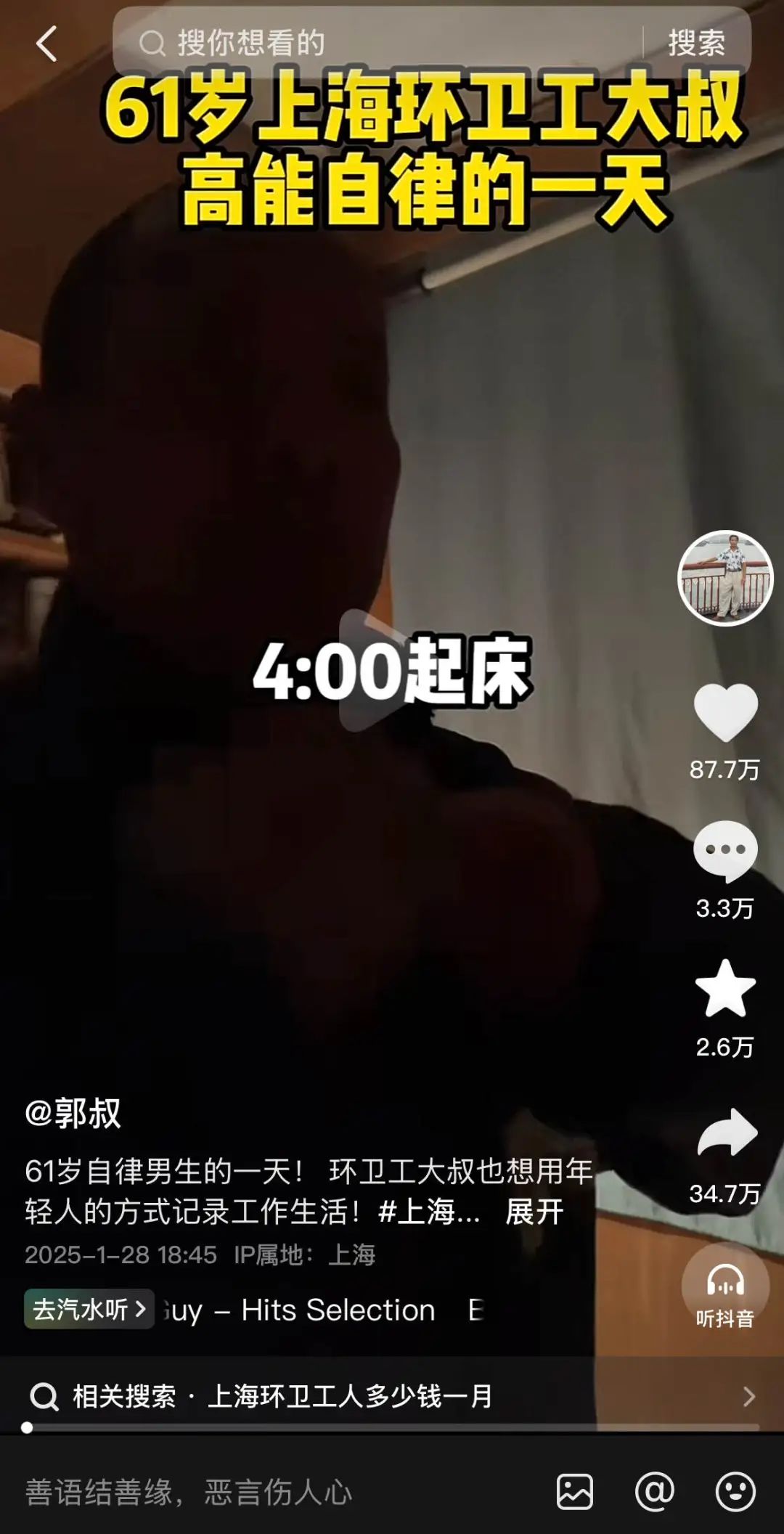 另一位60岁的上海环卫工人“郭叔”,凌晨4点起床外出打工, 直到晚上八点钟,大爷还在街上收拾垃圾,九点钟才下班。除了吃饭,一天的工作时间达到14小时。