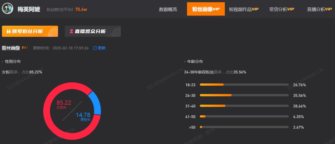 新名单下的抖音数据工具新抖显示,在“梅英阿嬷”的影迷画像中,24-30岁的影迷居多,占35.56%,从城市分布来看,新一线城市的影迷居多,占22.35%。