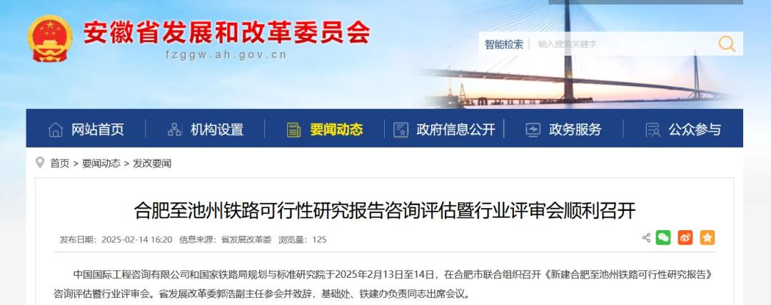 据安徽省发改委消息,中国国际工程咨询有限公司和国家铁路局规划与标准研究院于2025年2月13日至14日在合肥联合组织召开了《新建合肥至池州铁路可行性研究报告》咨询与评估会议和行业评估会议。