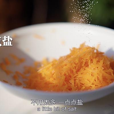 2、热菜挤出多余的水分,切碎。将胡萝卜擦成细丝,撒上一点盐,腌制 5 分分钟,挤出水分。