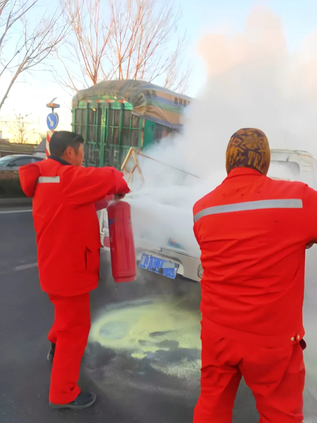 小货车司机站在一旁,脸色苍白,完全不知所措。焦建永和管鹏没有时间思考,迅速指挥工程车停在路边的安全区域。“快点,拿灭火器!” 在管鹏的命令下,两人迅速地从车上取下灭火器,毫不犹豫地冲向火车。