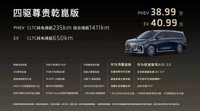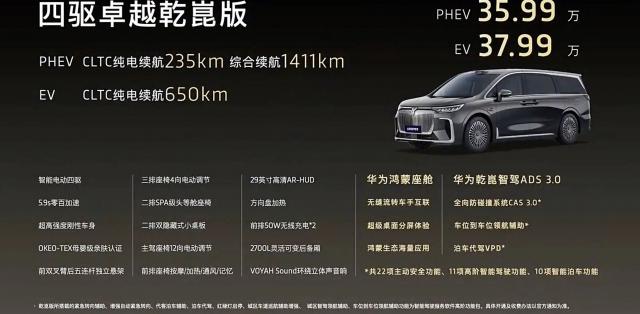 2 月 19 日本,岚图梦想家增加了两个新版本,分别是四驱卓越版和四驱高贵版。两个新版本都提供 PHEV 和 EV 这两种动力,其中 PHEV 动力2版的价格分别是: 35.99 万元和 38.99 万元;EV 动力2版的价格分别是: 37.99 万元和 40.99 万元。