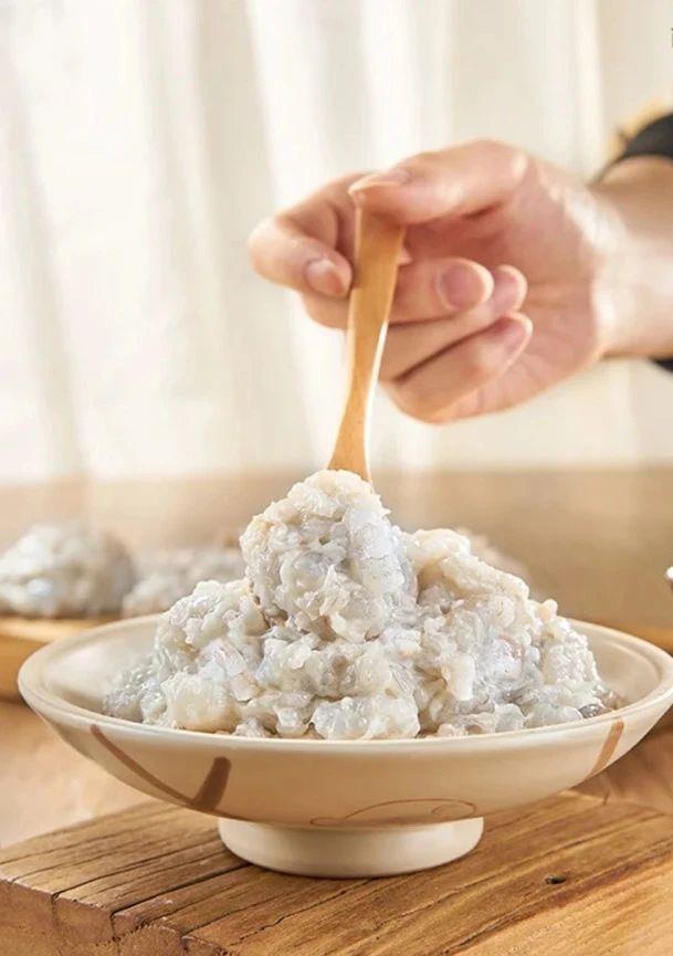 每天,水产师傅们亲自打捞、清洗、手工剥去虾线,再经过上千次的捶打,使虾肉更加粘稠。