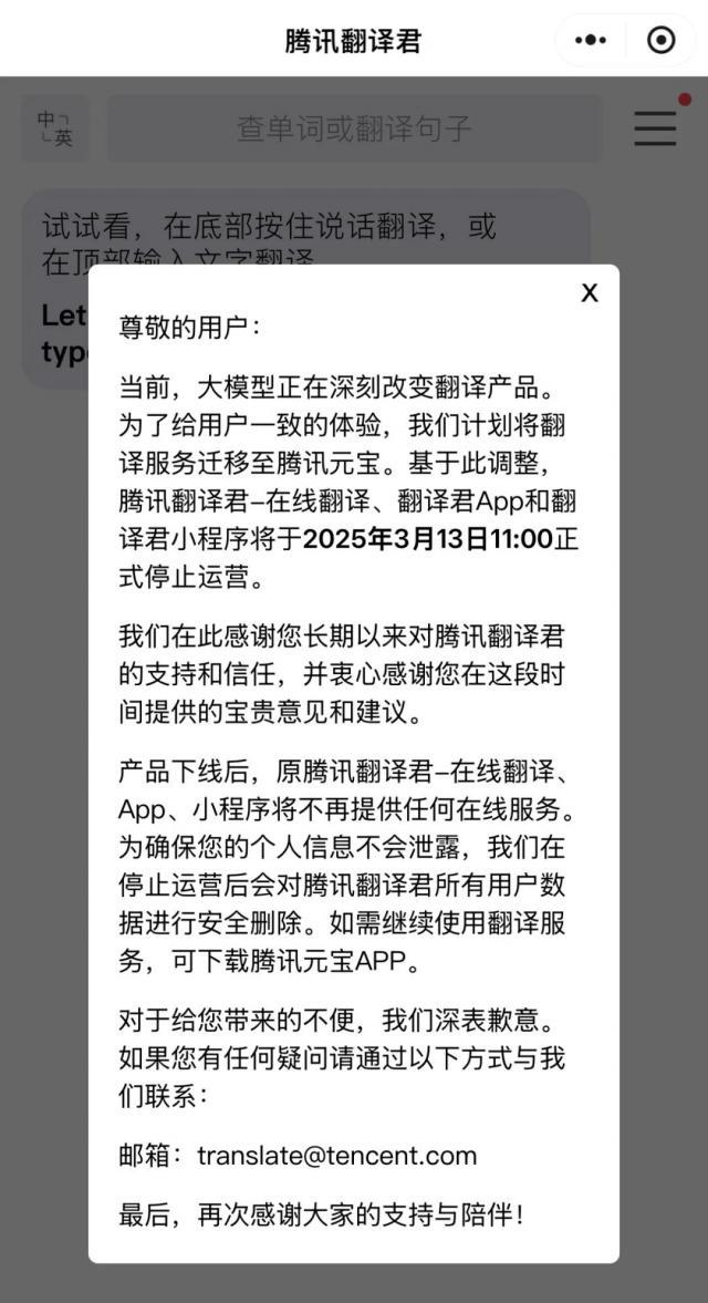 最近,腾讯翻译君官网和小程序页面显示,腾讯计划将翻译服务转移到腾讯元宝,以给用户一致的感受。基于此,腾讯翻译君在线翻译。App 和小程序在一起 2025 年 3 月 13 日 11:00 正式停止运营。