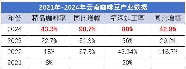 2024 每年咖啡豆的精品率约为 43.3%,近乎 2023 年度翻番水平,同比增长也突破了二位数。